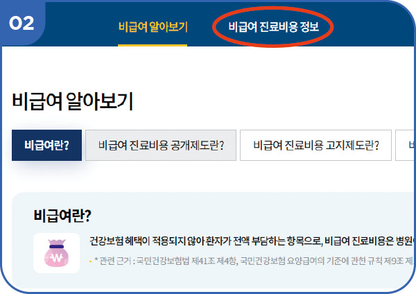 비급여 진료비용 공개제도에 대해서 알아보고 상단에 ‘비급여 진료비용 정보’ 탭을 클릭한다.